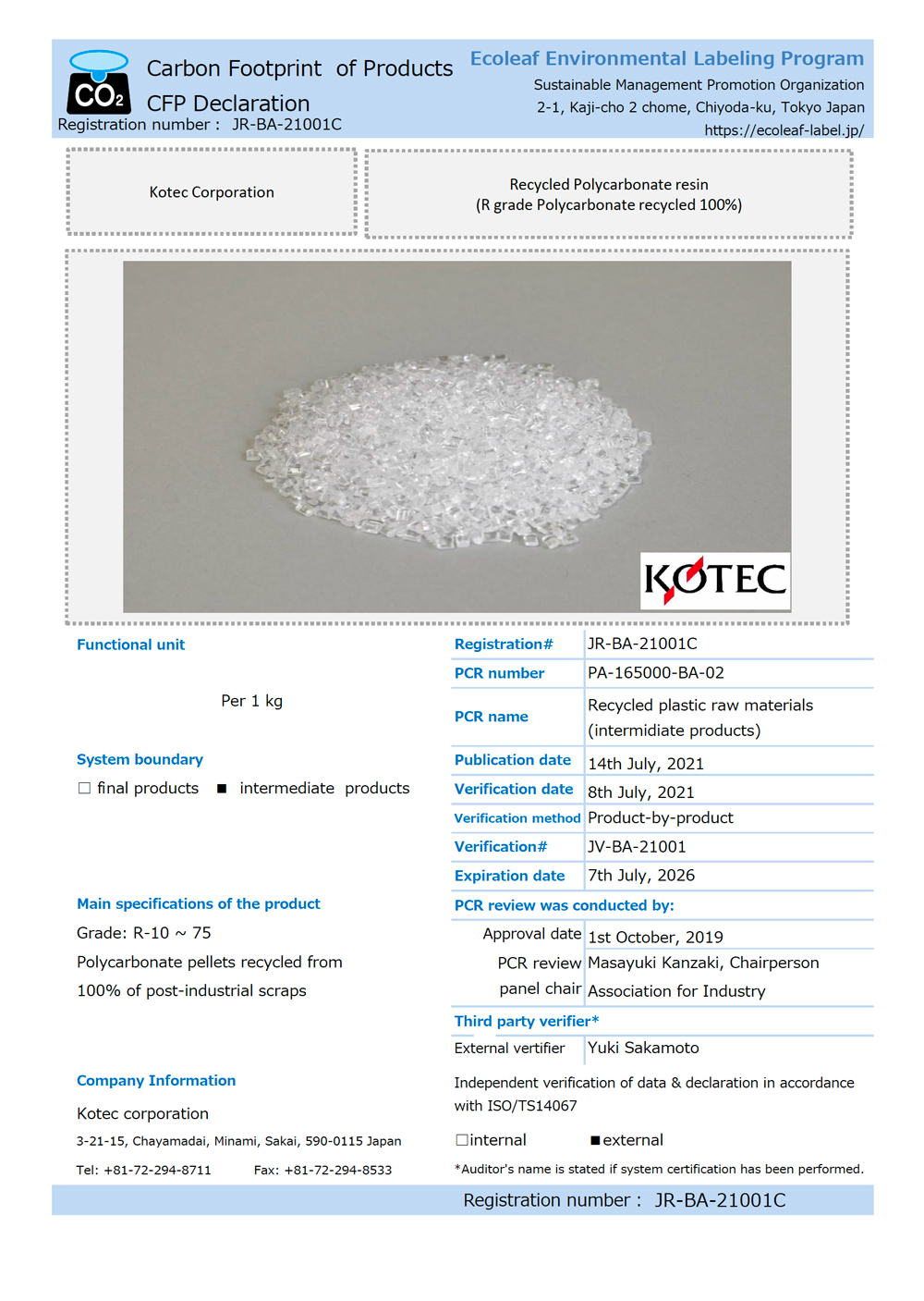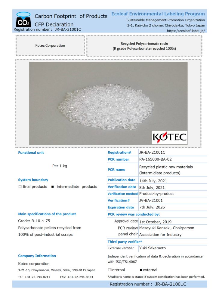Our R grades (Recycled PC) and RS grades (Recycled PPS) are certified as “Eco Leaf declaration” and “CFP declaration” (Carbon Footprint of Products) by Sumpo (Sustainable Management Promotion Organization).