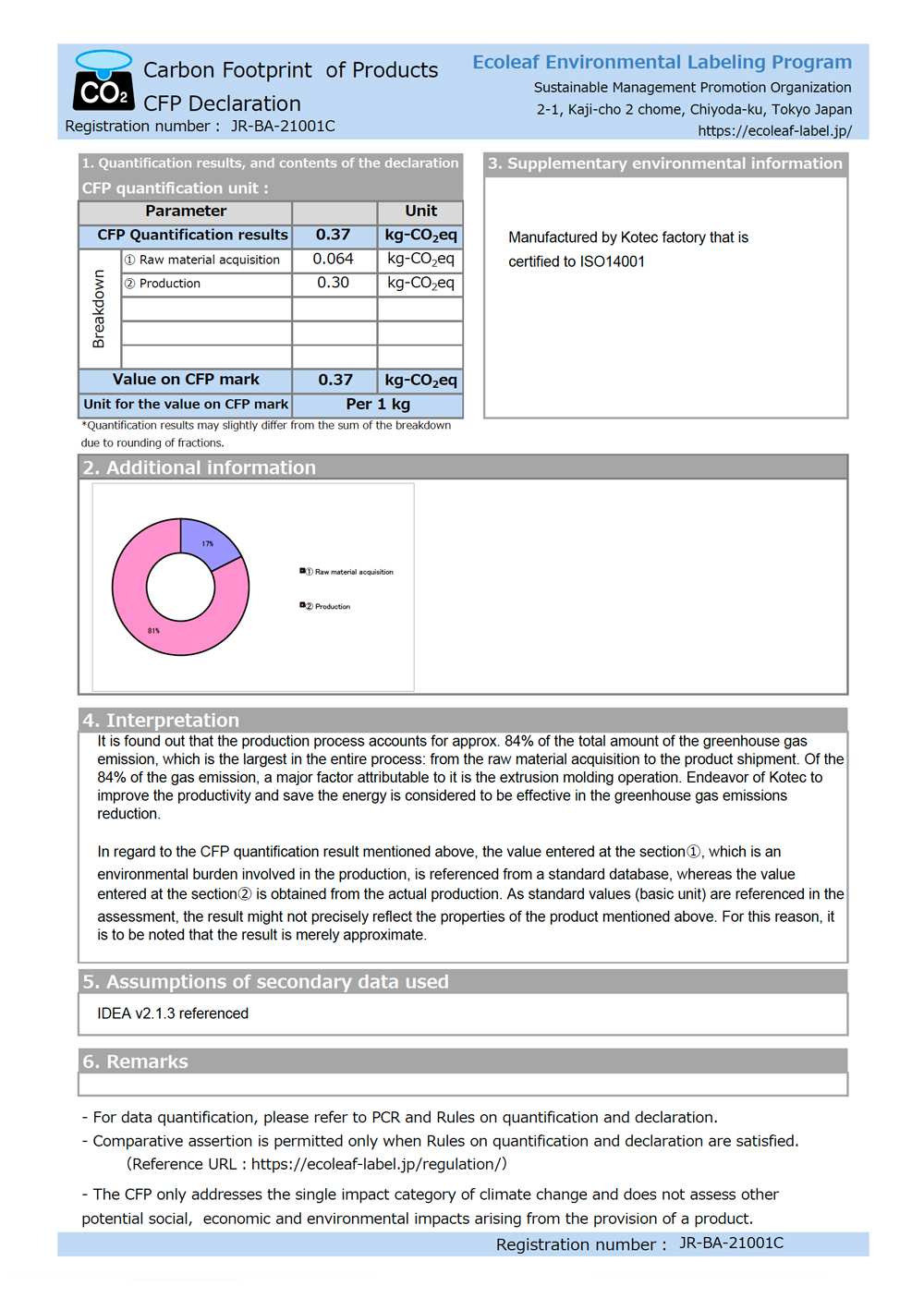 The CFP declaration illustrates the total amount of CO2 to be emitted in the whole process of our operation from raw material procurement to product delivery – 0.37 kg-CO2eq.